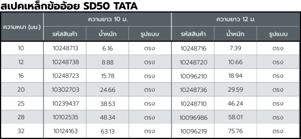มาตรฐาน : เป็นไปตามมาตรฐานเหล็กข้ออ้อย (SD – Standard Deformed Bars)