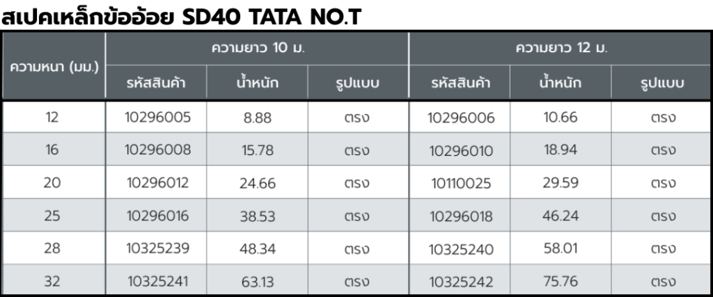 มาตรฐาน : เป็นไปตามมาตรฐานเหล็กข้ออ้อย (SD – Standard Deformed Bars)