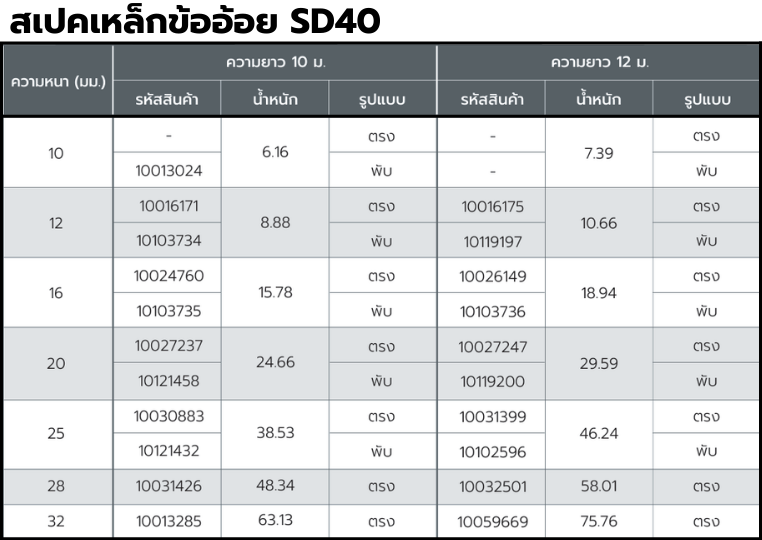 มาตรฐาน : เป็นไปตามมาตรฐานเหล็กข้ออ้อย (SD – Standard Deformed Bars)