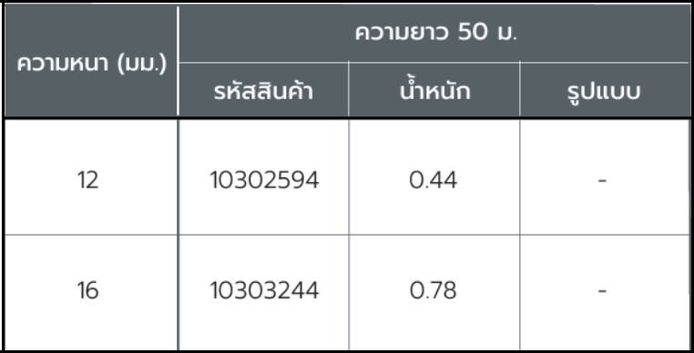 | ความหนา (มม.) | ความยาว 10 ม. | ความยาว 12 ม. | ความยาว 50 ม. | ขอราคาที่นี่! | ||||||